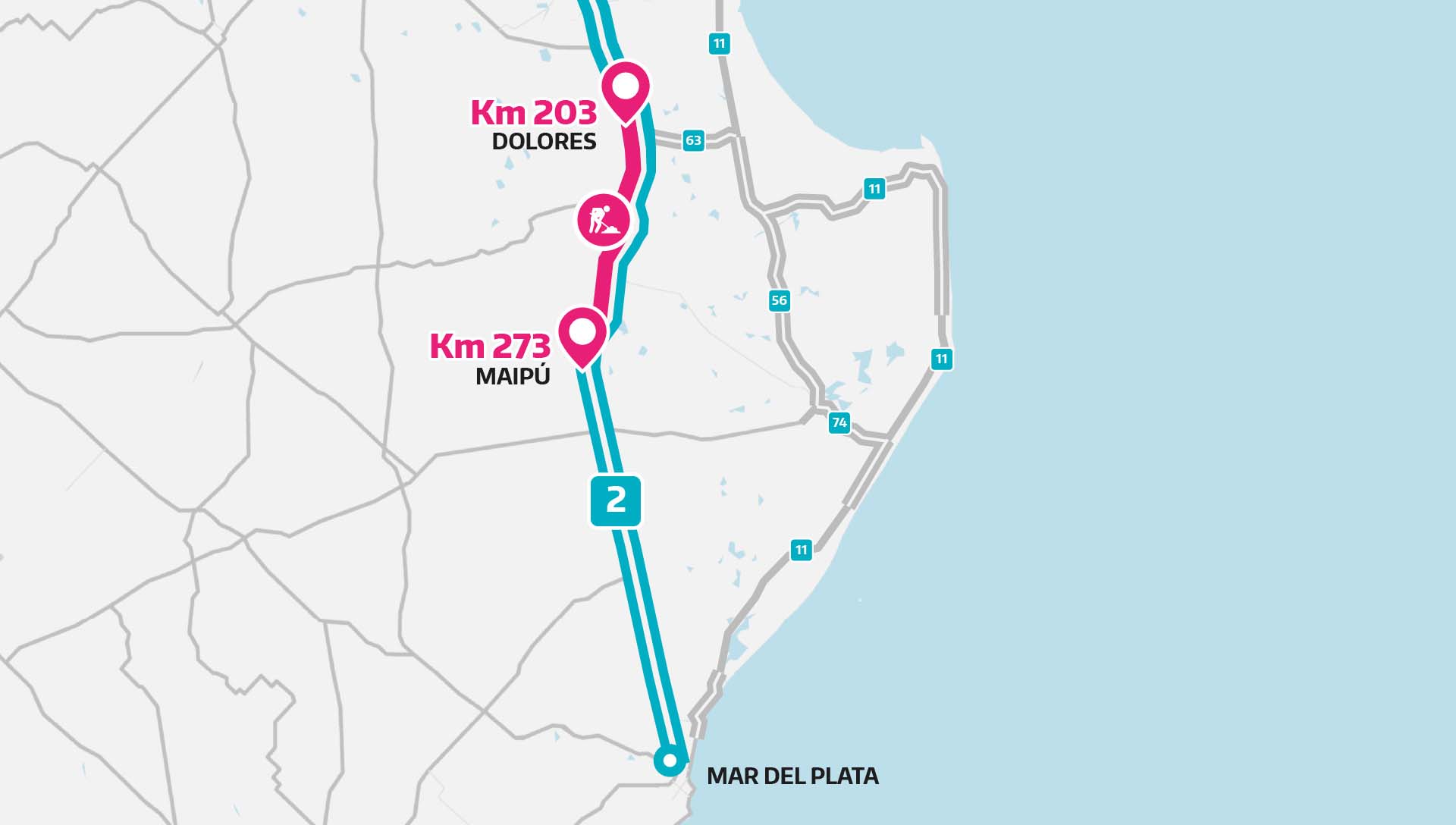 A fines de Octubre 2025 semana comenzaron los trabajos de repavimentación entre el km 203 (Isla YPF) y el km 207 (Distribuidor R.P. 63), tramo clave para la temporada turística.